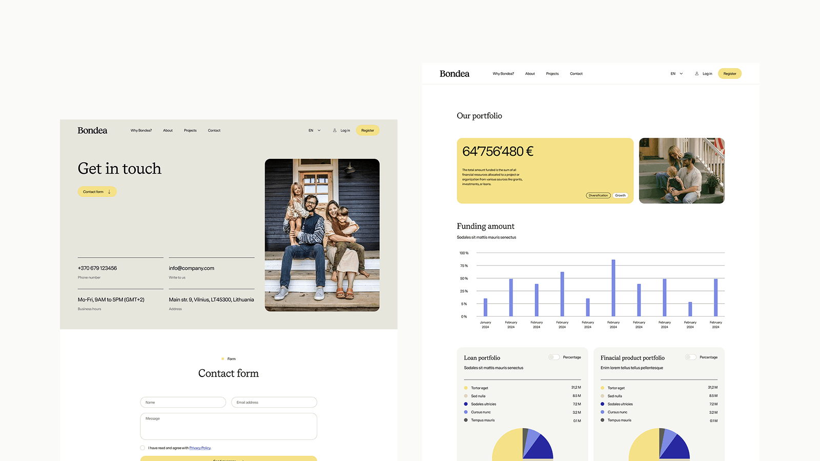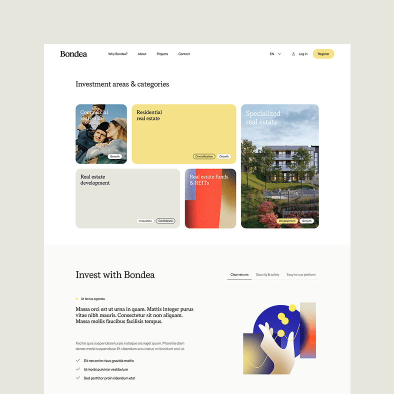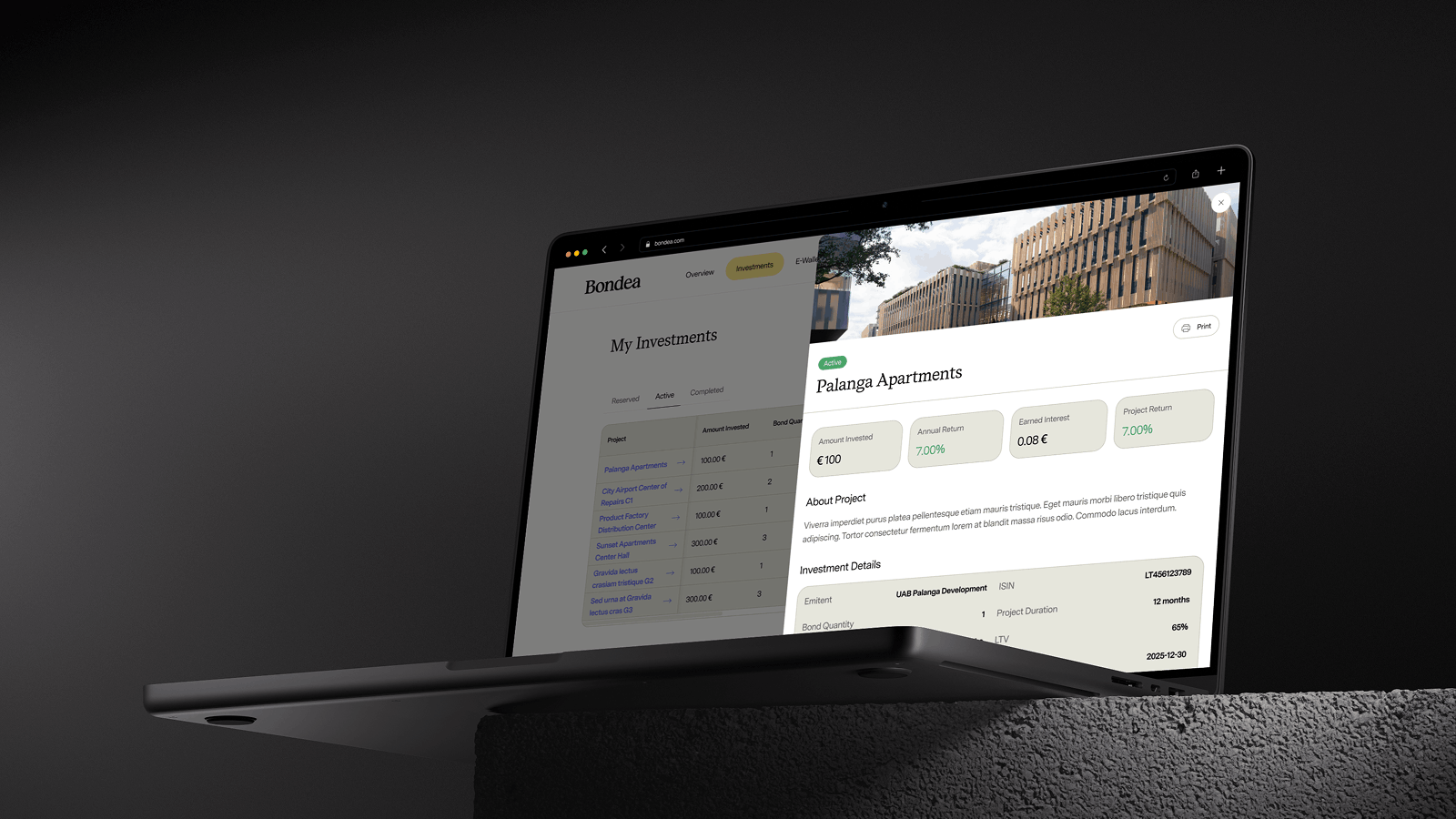 Bondea – atvira obligacijų platforma tiems, kurie nori auginti kapitalą ramiai ir užtikrintai: nuo kruopščiai atrinktų projektų iki aiškios investavimo logikos vienoje vietoje. Mūsų darbas – šiai patirčiai suteikti vizualinį pamatą ir skaitmeninius sprendimus, kurie kuria pasitikėjimą nuo pirmo sąlyčio taško.