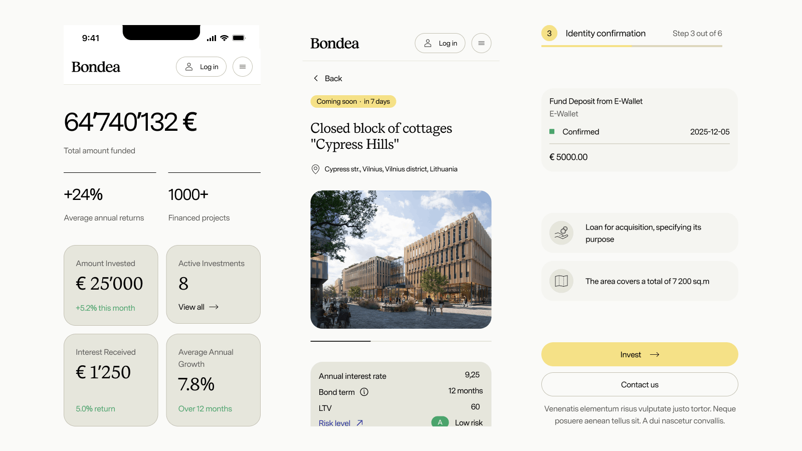 Visa tai sujungėme į vientisą Bondea konceptą: unikali UI kalba, savitas stilius ir detalės, kurios įtvirtina patikimumą. Rezultatas – išgryninta platforma, kurioje dizainas ne demonstruoja formą, o tyliai padeda jaustis užtikrintai ir saugiai.