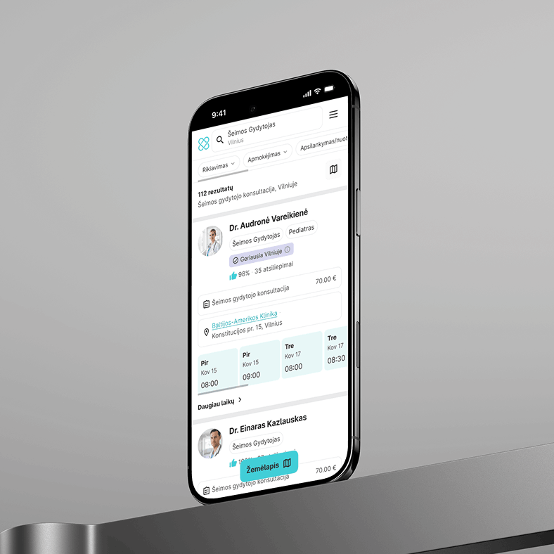 UX įžvalgos tapo pagrindu visos platformos UI atnaujinimui. Mūsų tikslas buvo ne tik vizualinis „upliftas“, bet ir nuosekli, logiška patirtis, kuri padėtų vartotojui jaustis užtikrintai sprendžiant jautrius sveikatos klausimus. Atnaujintas dizainas padėjo aiškiau struktūruoti informaciją, supaprastinti paieškos ir filtravimo scenarijus bei užtikrinti sklandžius registracijos ir užsakymo srautus visoje platformoje.